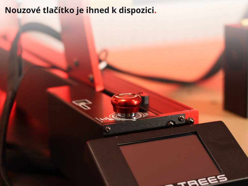 Tento CNC gravírovací stroj je bezpečnostní třídy 4 a může způsobit vážné a trvalé poškození nebo úplnou ztrátu zraku, popálení a jiné úrazy. Nikdy se nekoukejte přímo do laseru a to ani s ochrannými brýlemi. Nenechávejte se strojem pracovat děti. Odražený paprsek na vzdálenost několika metrů může způsobit slepotu. Zároveň může odraz laseru způsobit vznícení některých materiálů a hrozí tak vznik požáru. Nikdy tak nenechávejte přístroj bez dozoru a po použití ho vždy vypněte, nejlépe ze zdroje napájení.