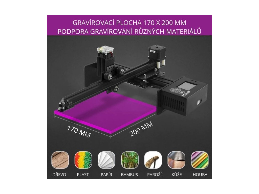 - Materiál vhodný ke gravírování: dřevo, plast, papír, bambus, kůže, houba a další