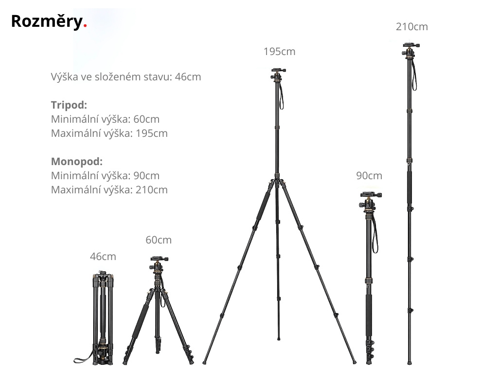 Stativ s dvoudílnou středovou tyčí, který vám umožní dosáhnout dosud nedosažitelných výšin. Maximální výška stativu je totiž 195cm a lze ho jednoduše přeměnit na monopod s výškou až 210cm.