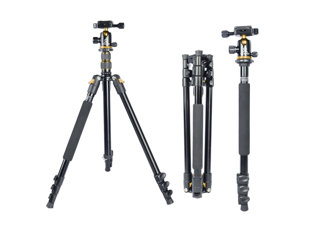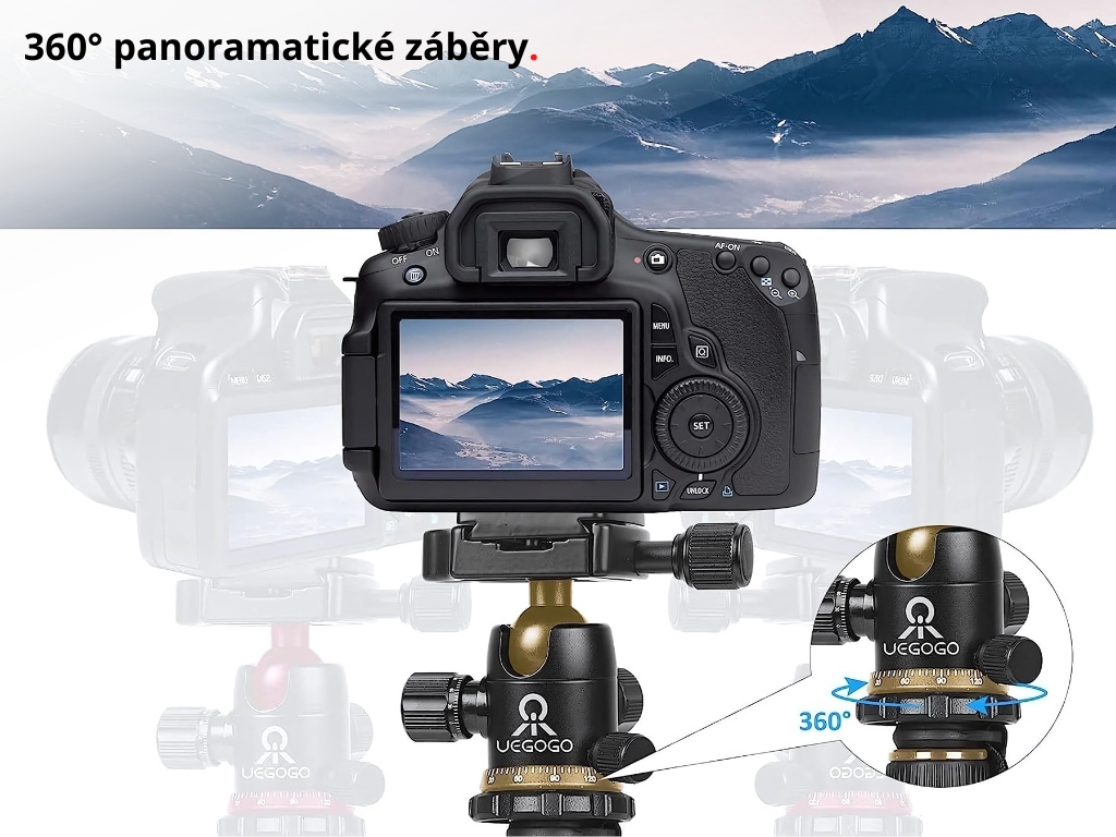 Panoramatická kulová hlava se může otáčet o 360 stupňů a umožňuje prakticky neomezené kouzlení s nastavením úhlu. Protiskluzové gumové nohy se postarají o stabilitu a o to, že stativ vždy zůstane pevně na svém místě. Stativ je lehký a skladný, takže ho můžete snadno vzít kamkoli s sebou. Složený měří pouhých 46cm a váží jen 1,4kg a součástí je i praktická taška.