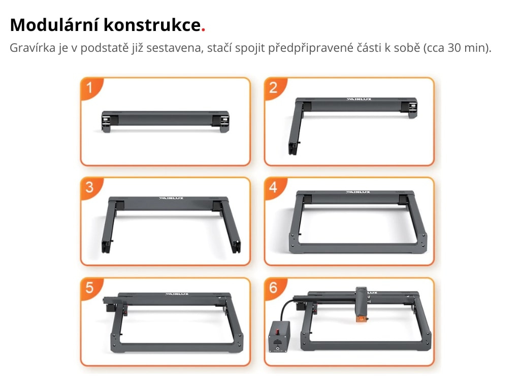 Pokud byste se sestavením ale nechtěli ztrácet čas a případně potřebovali i zaškolit, využijte toho, že jsme zavedení distributoři této značky. Denně tyto stroje testujeme a jsme připraveni vám s používáním pomoct. Mrkněte do souvisejících produktů a vyhledejte naší službu Gravírka GO HOME. I bez ní ale můžete počítat s naším plným supportem, záručním i pozáručním servisem a poradenstvím, které poskytujeme.