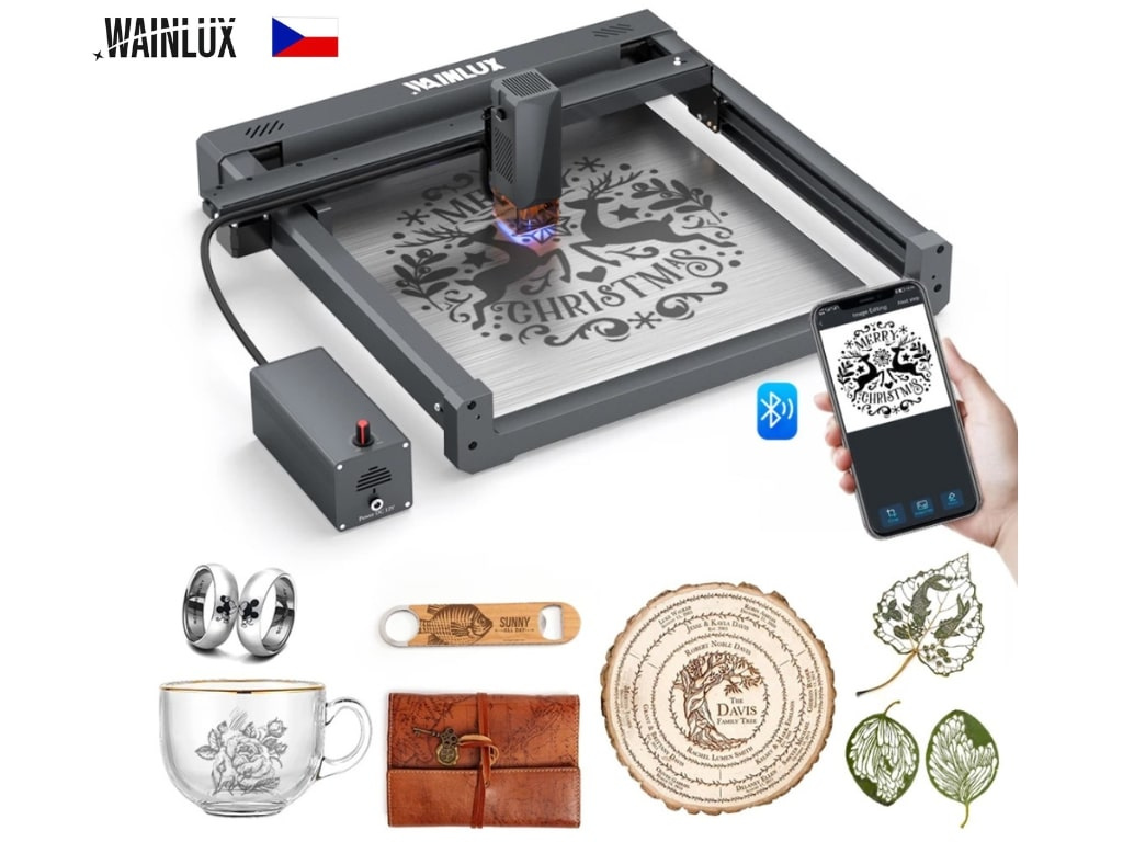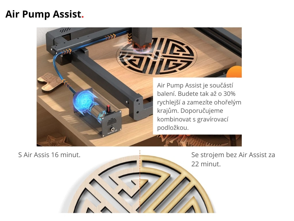 Hlavní výhodou této vlajkové lodi od Wainlux je její výkonný a efektivní laser s duální kompresní diodou o výkonu až 10W (2x5W) se kterým můžete gravírovat do většiny myslitelných materiálů. K tomu vám pomůže i Air Assist Pumpa, která je součástí balení. Zrychluje gravírování a eliminuje oharky, které jsou nejvíce patrné u gravírování do dřeva.