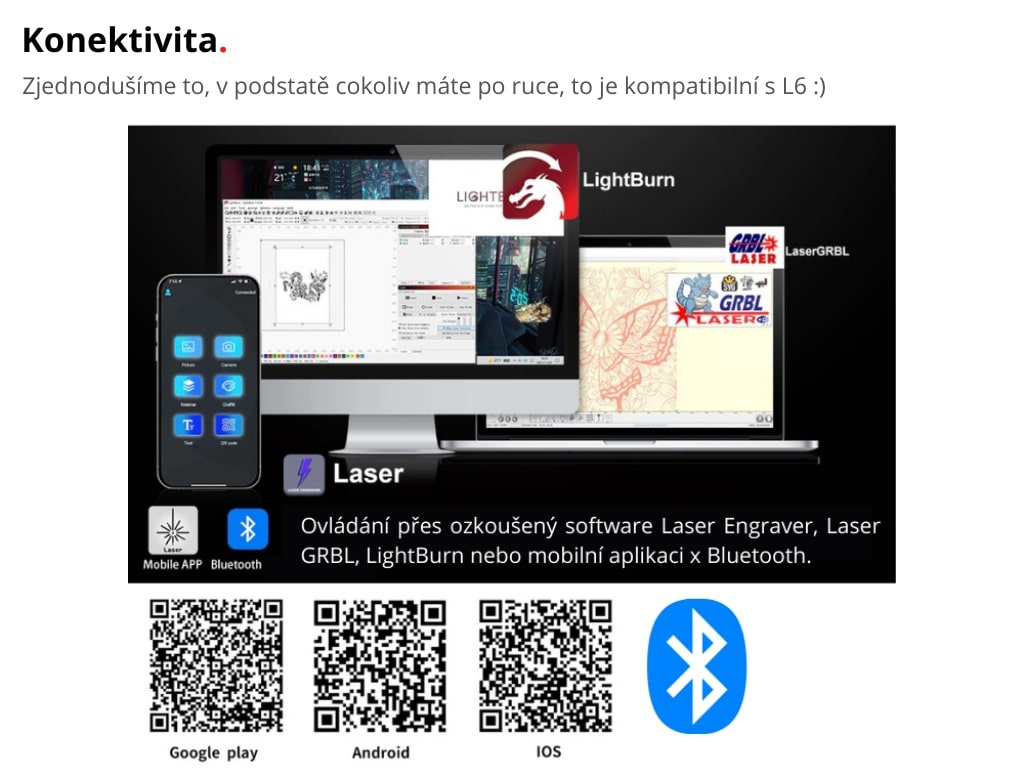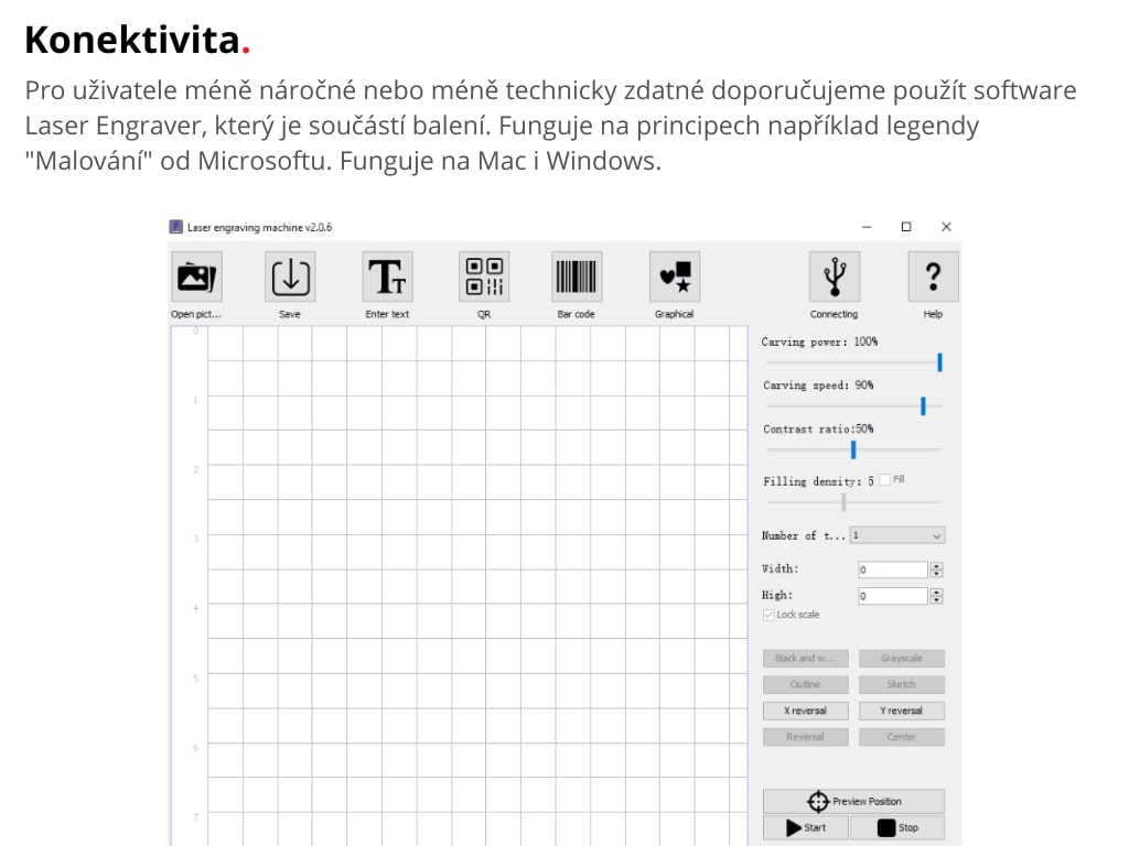Po sestavení konstrukce (zabere cca 30 minut) se stroj ovládá přes klasický desktop nejlépe s Windows MacOS nebo Linux. Kompatibilní je s běžně dostupnými software Laser GRBL (všechny důležité funkce zdarma, pouze pro Windows) nebo LighBurn (placené cca 60$, profi, Windows, MacOS, Linux), odkazy na software jsou samozřejmě i součástí balení. Stejně tak návod na sestavení.